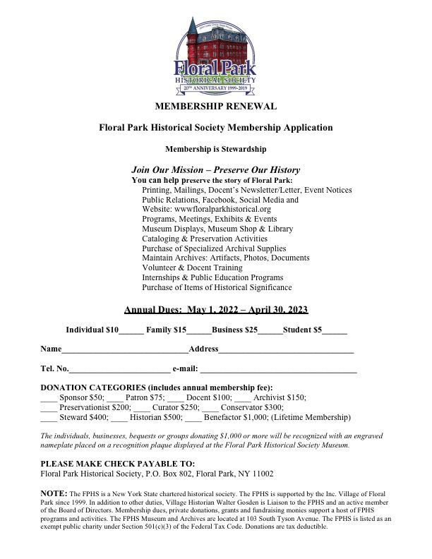 Make checks payable to: Floral Park Historical Society
